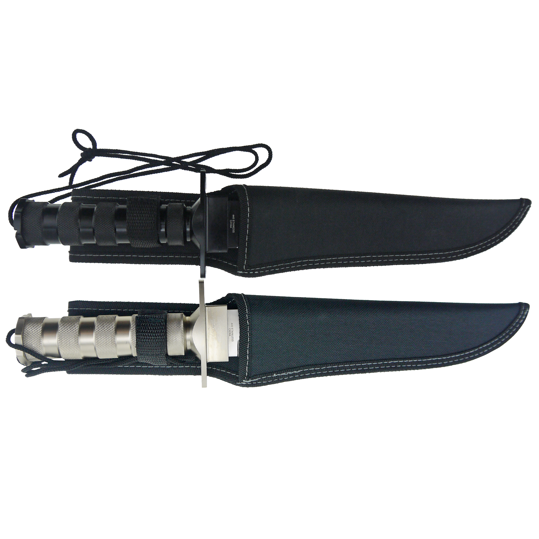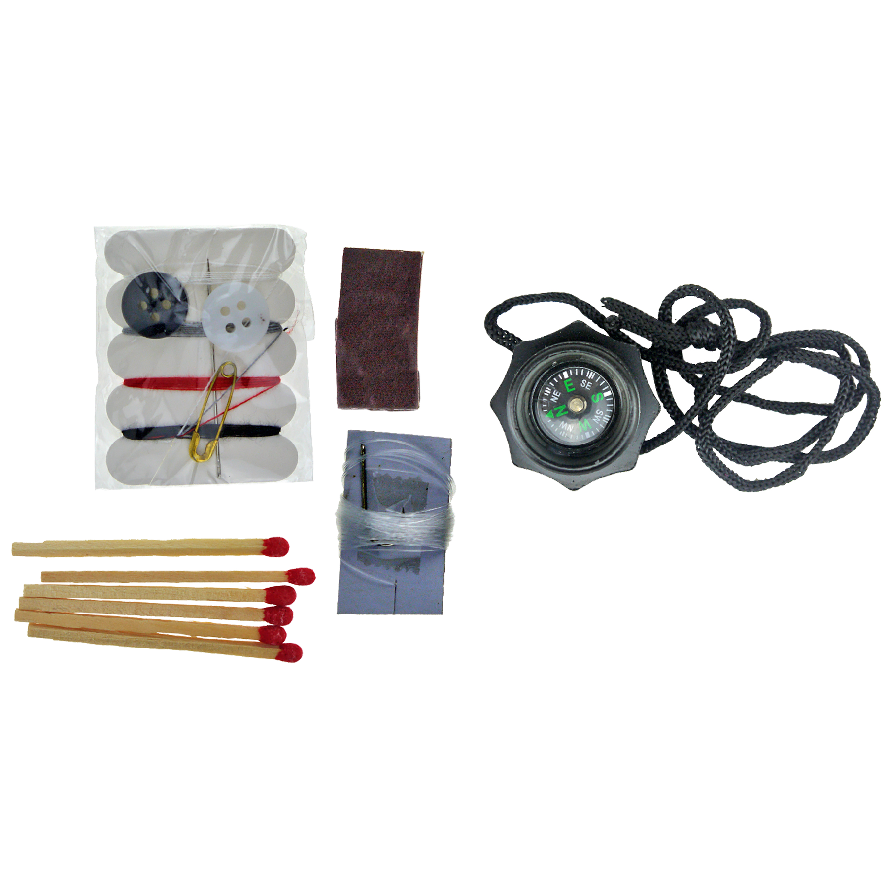 - Includes: Knife, Sheath, Compass with lanyard, Sewing Kit, Flint, Fishing Nylon String with hook, and Matches.